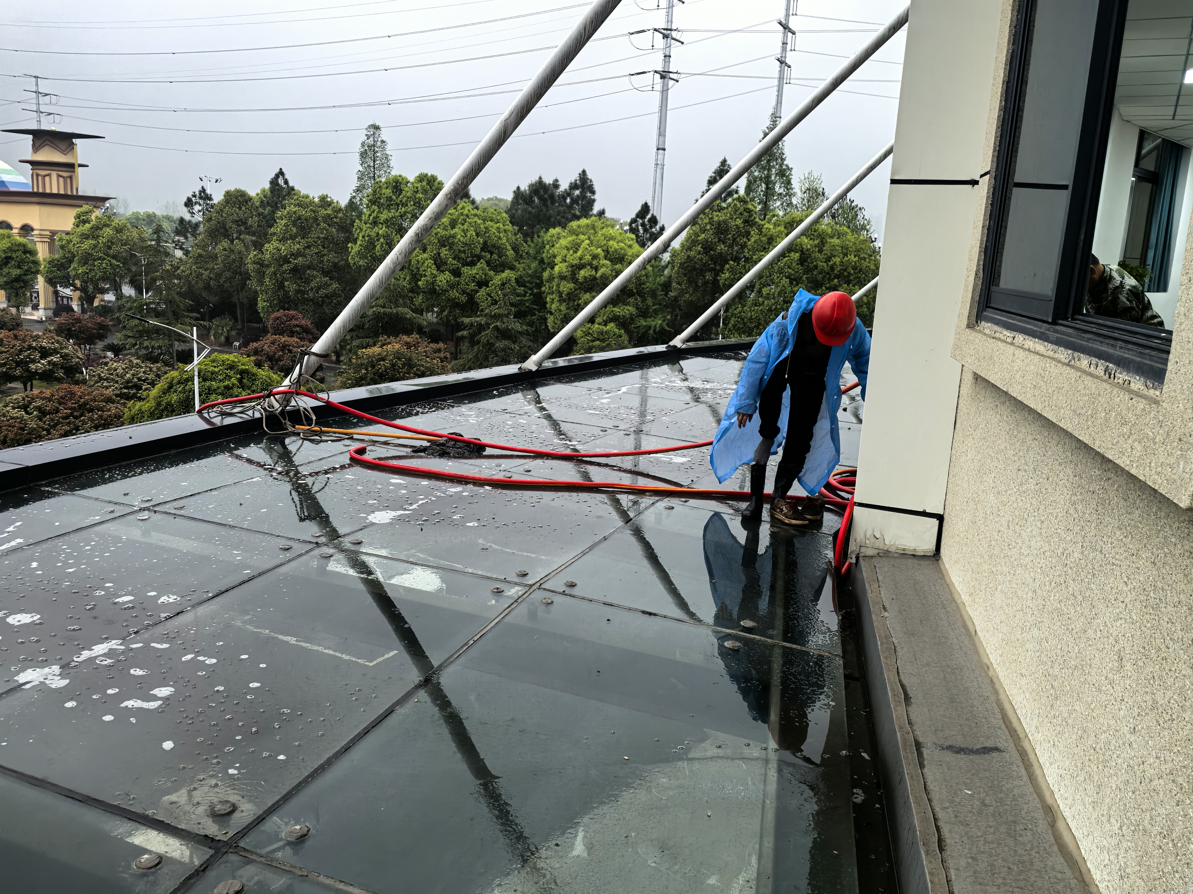 (通讯员 皮敏)4月10日,降雨突袭校园,为优化校园环境、保障师生舒适出行,后勤处工作人员不畏风雨、坚守岗位,身着雨衣对图书馆前厅玻璃雨棚开展全面清洁作业,用实干守护校园洁净。